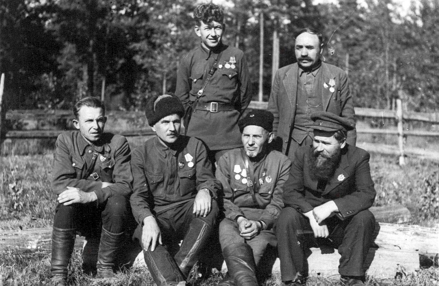 С.А. Ковпак, П.П. Вершигора (сидят третий и четвёртый слева) среди партизан.